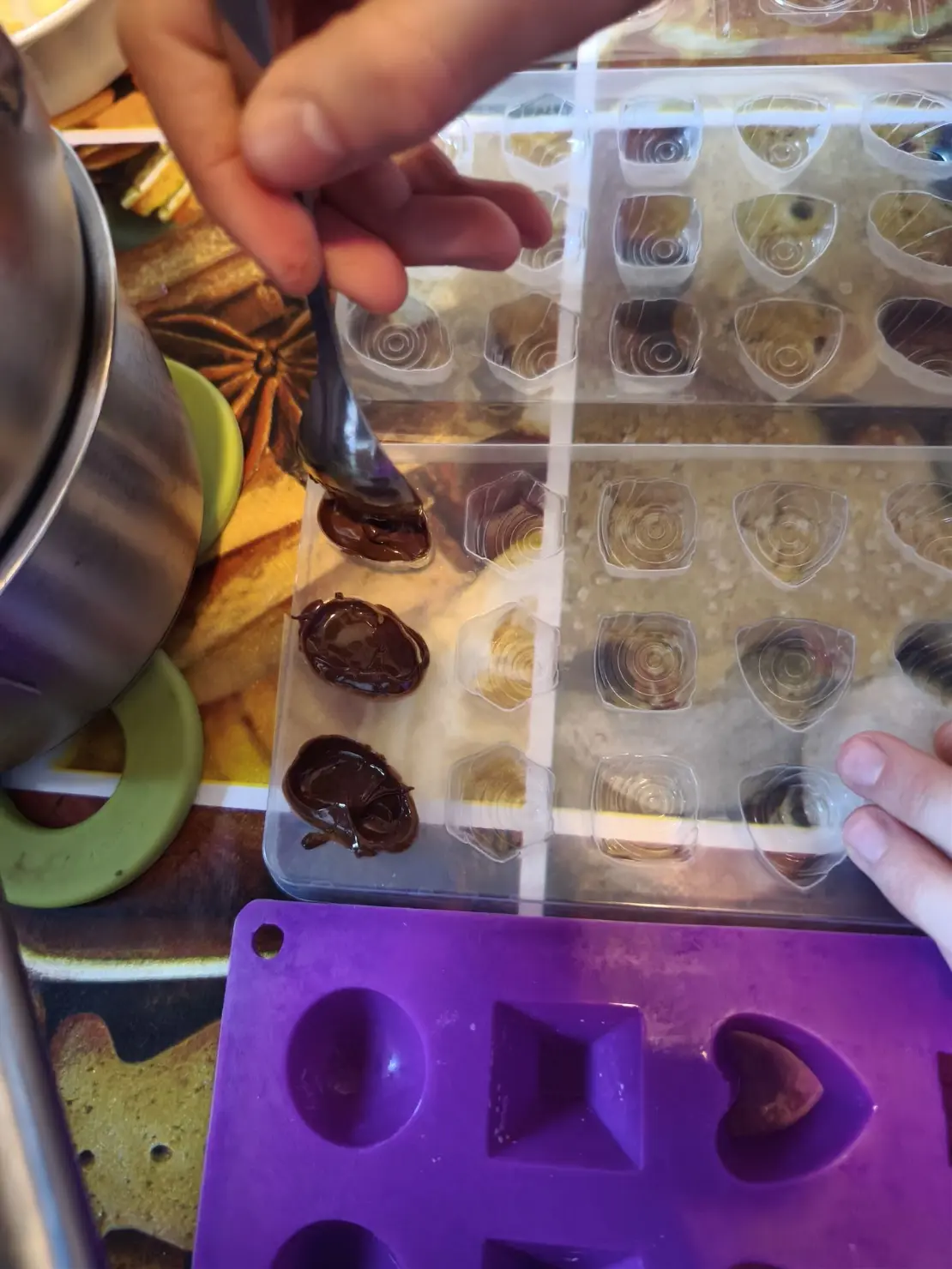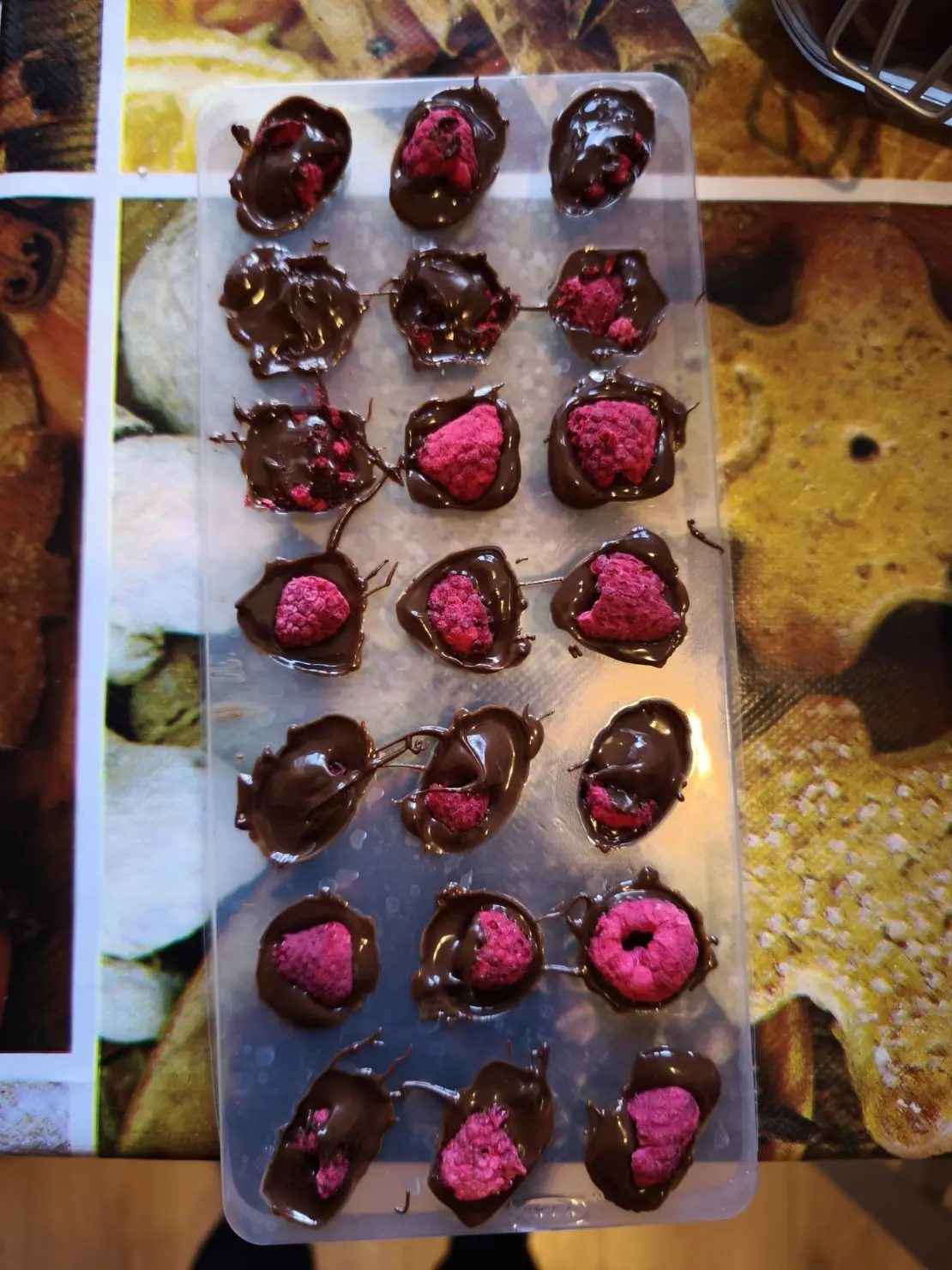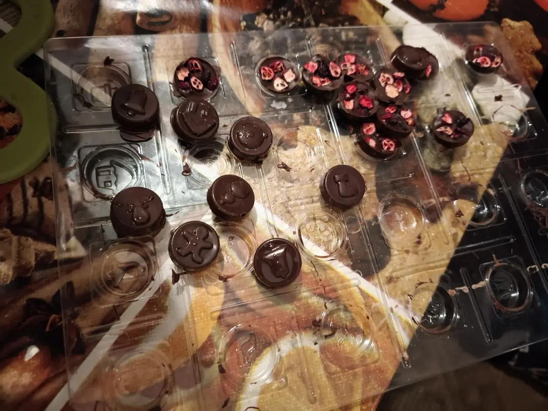 Czekoladę należy stopić w miseczce umieszczonej na rondlu z wodą, zdejmując z ognia zanim się całkowicie rozpuści, a następnie przelać do foremek. Jeżeli umiesz, możesz ją stemperować (my nie umiemy). Zanim czekoladki zastygną, możesz umieścić w nich ulubione dodatki. W naszym przypadku były to prażone orzechy laskowe i suszone wiśnie, dopóki aparaty ortodontyczne w rodzinie nie zmusiły nas do zmiany ich na własnoręcznie suszone żurawinę i truskawki oraz liofilizowane maliny i papaje. Kiedy zastygną, zawiń je w folię aluminiową i umieść w opakowaniach.