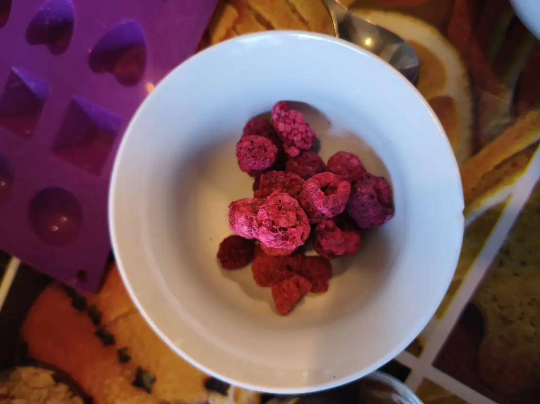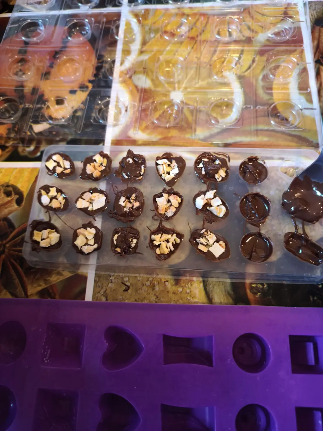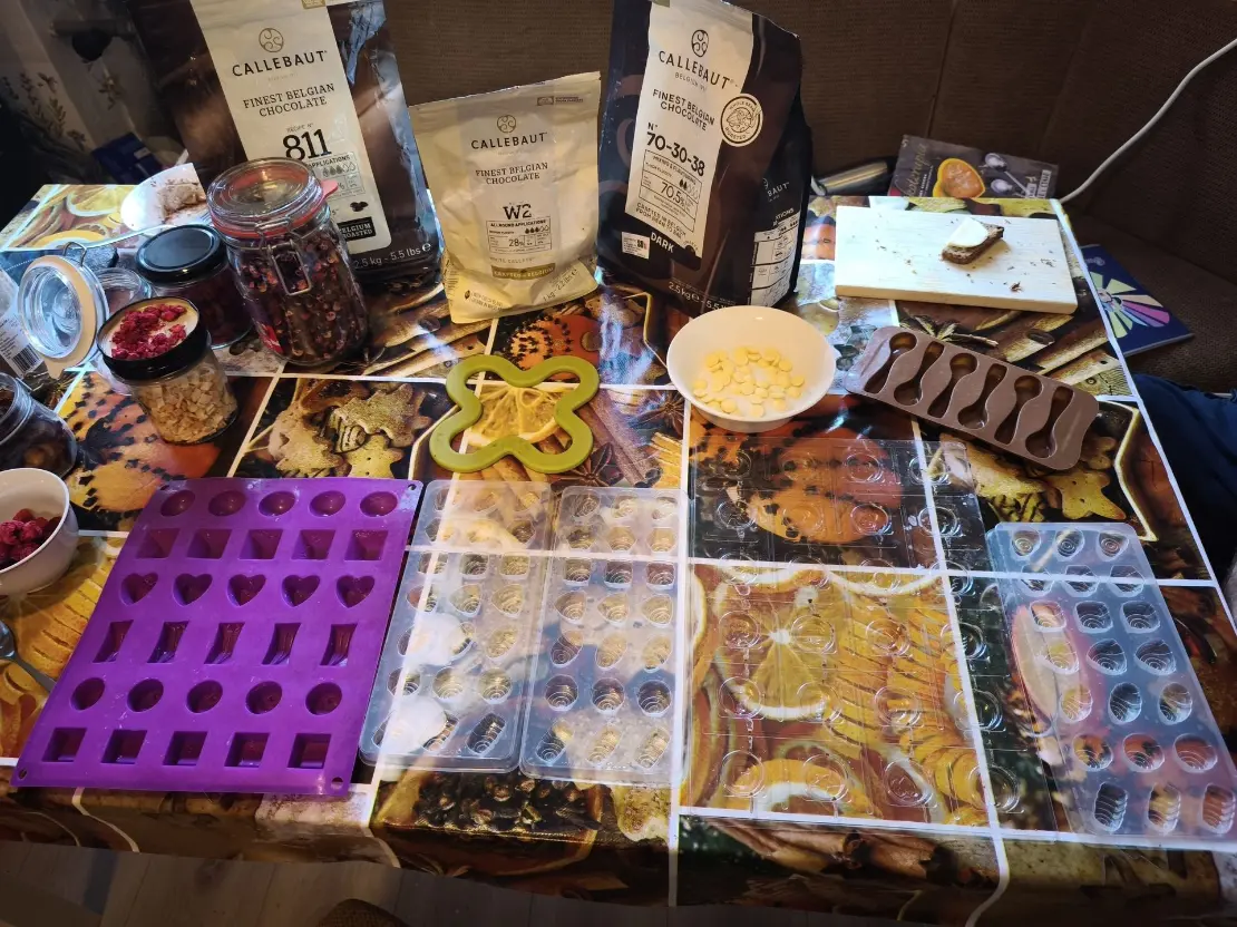 Czekoladę należy stopić w miseczce umieszczonej na rondlu z wodą, zdejmując z ognia zanim się całkowicie rozpuści, a następnie przelać do foremek. Jeżeli umiesz, możesz ją stemperować (my nie umiemy). Zanim czekoladki zastygną, możesz umieścić w nich ulubione dodatki. W naszym przypadku były to prażone orzechy laskowe i suszone wiśnie, dopóki aparaty ortodontyczne w rodzinie nie zmusiły nas do zmiany ich na własnoręcznie suszone żurawinę i truskawki oraz liofilizowane maliny i papaje. Kiedy zastygną, zawiń je w folię aluminiową i umieść w opakowaniach.