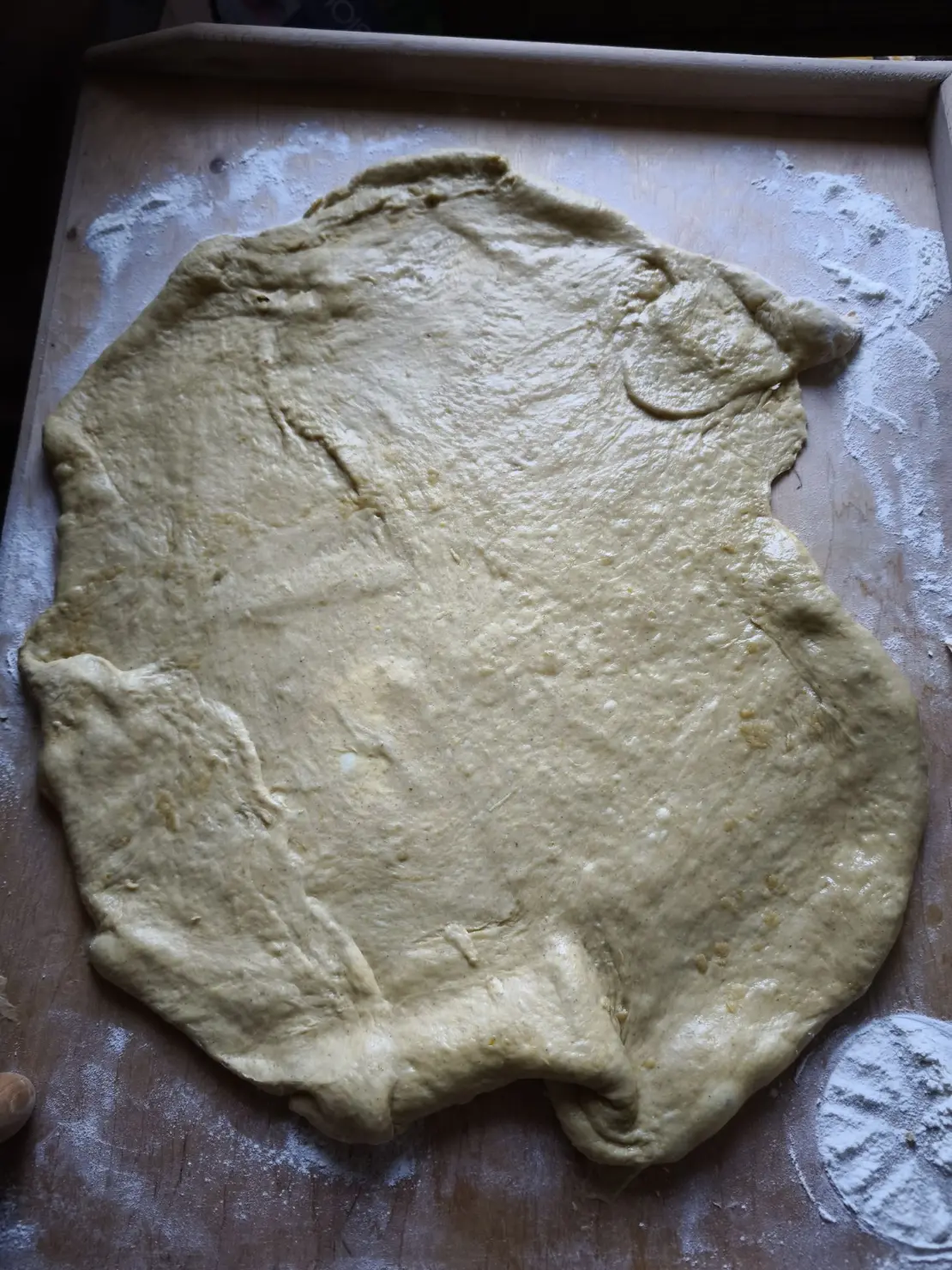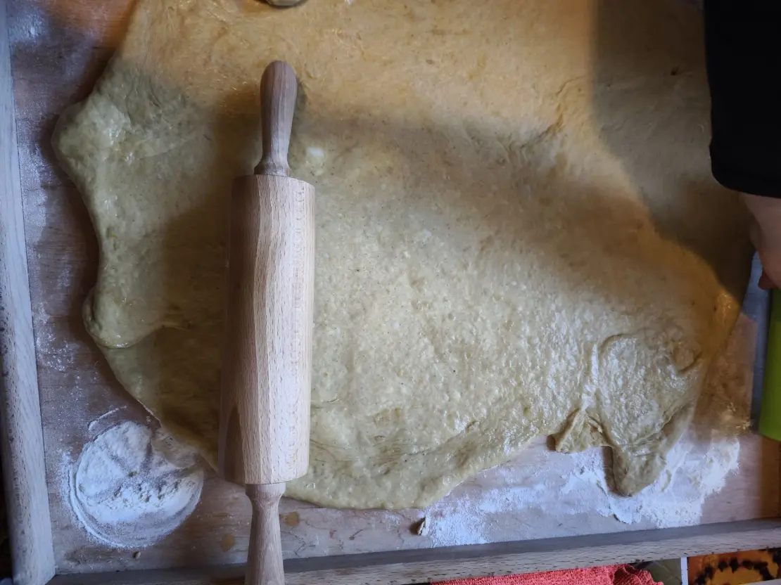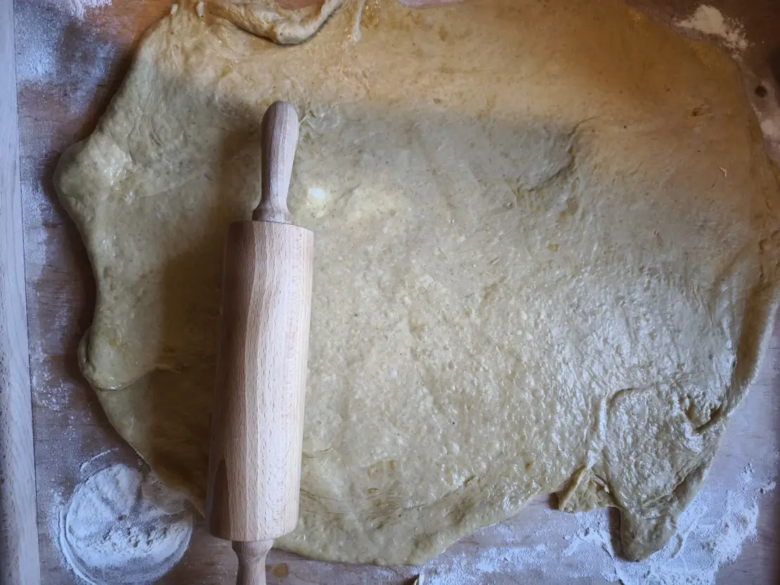 Jeżeli masz świeże drożdże, zrób z nich rozczyn i wymieszaj z mąką, a jeżeli suche, po prostu wymieszaj je z mąką. Następnie dodaj resztę składników, masło jako ostatnie. Wyrób ciasto, aż będzie miękkie i elastyczne, uformuj w kształt kuli i włóż do miski, oprószonej mąką, by się nie lepiła, a następnie przykryj ręcznikiem kuchennym lub ścierką i odstaw w ciepłe miejsce, aż podwoi swoją objętość.